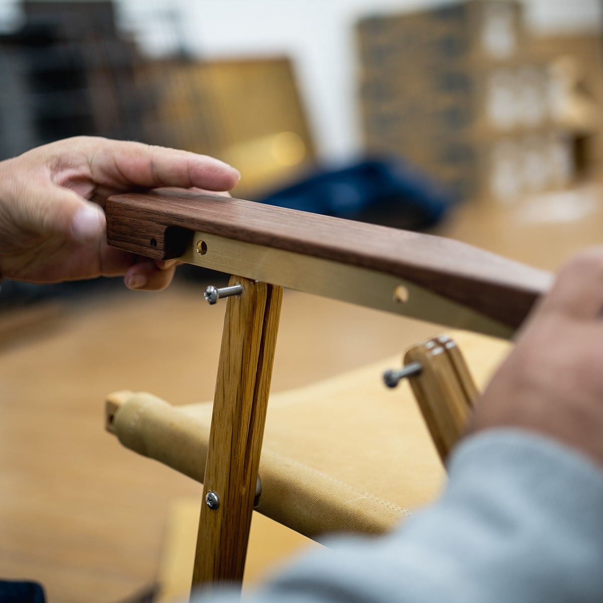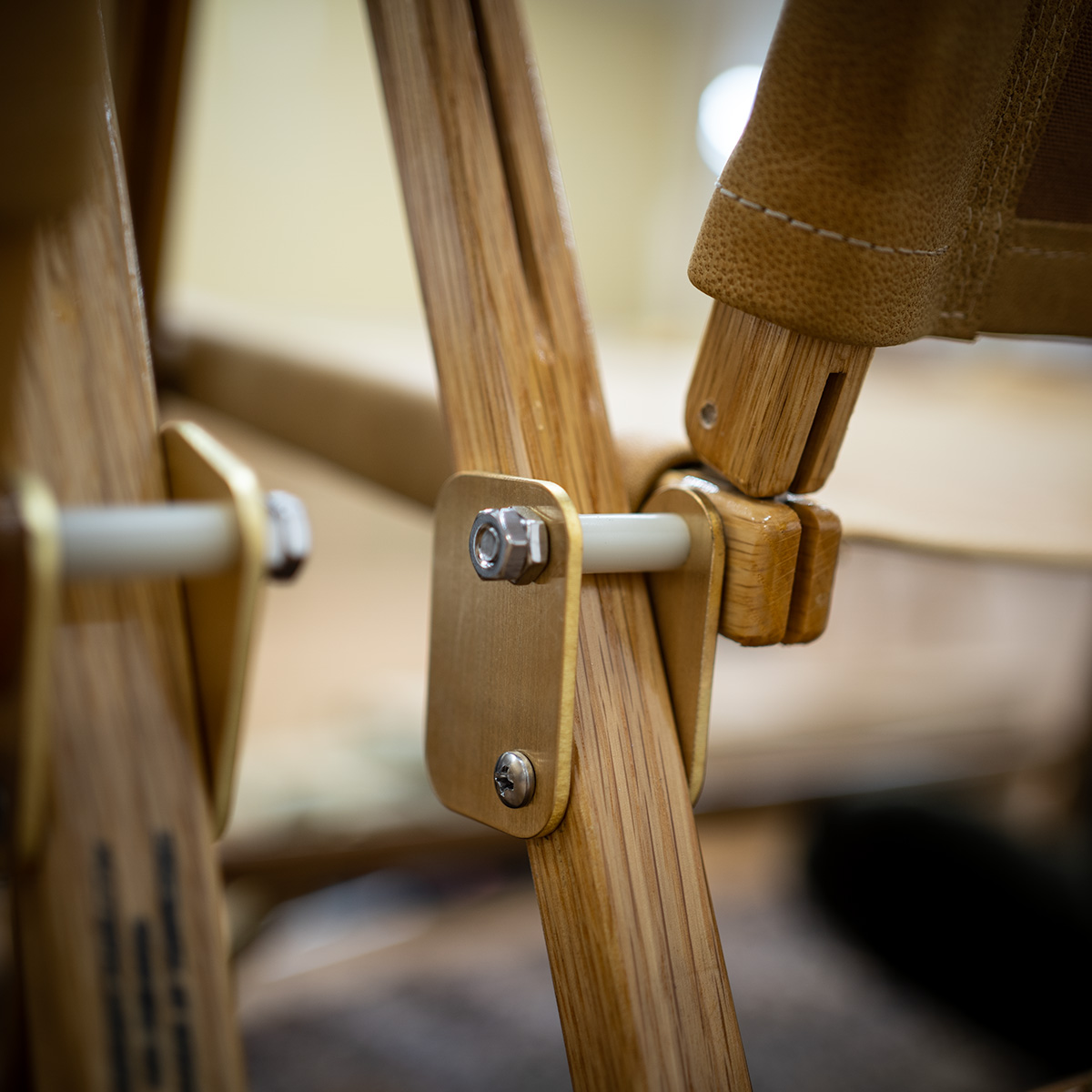 真鍮の経年変化を楽しみながらビンテージ感を演出、アルミに比べ、ずっしりと重みのある真鍮パーツは特別な一脚にしてくれます。
